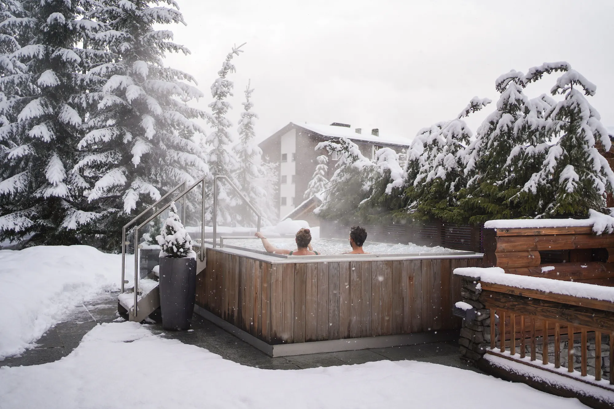 Beyond the staff, The Lodge’s own facilities astonish. A spa floor is built around a heated 9-metre indoor pool and steam room. Step outdoors from the lounge and you’ll find a second, hot-water Jacuzzi perched on the terrace, warm beneath starlight while snow falls gently around. Fitness enthusiasts have a full gym at their disposal, and anyone seeking entertainment can descend to the private party suite. After hours, the main living room beckons: rich carpets and velvet sofas circle a grand fireplace, sliding glass doors vanish to let in the winter panorama. In short, The Lodge has it all, pools, hot tubs and combines the warmth of a wood-clad mountain home with a level of polish rarely seen outside of a private palace.